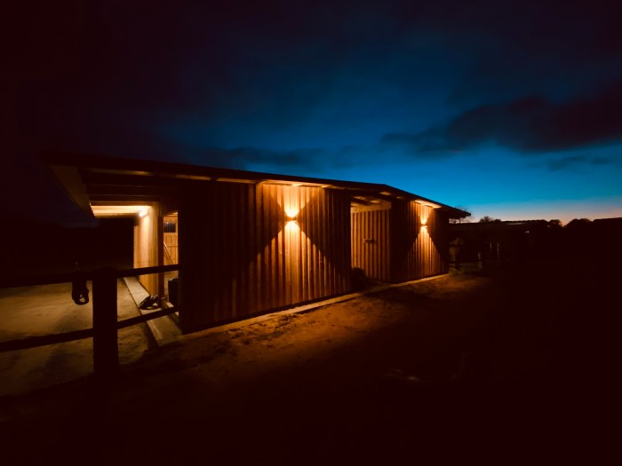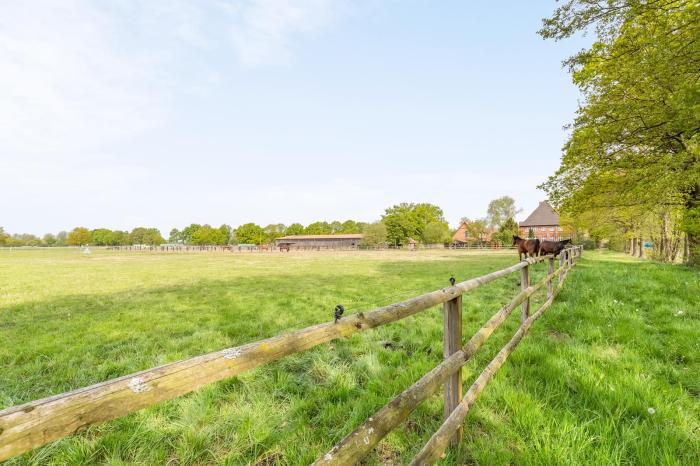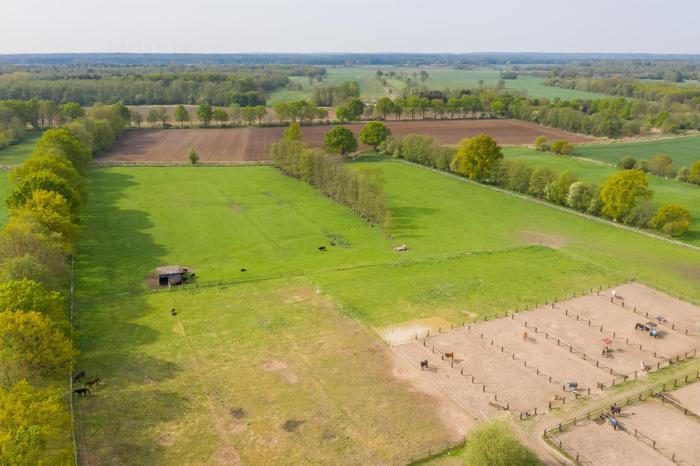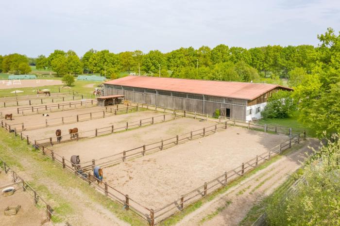Der Hof verfügt über 27 großzügige Boxen, großflächige Paddocks, eine 20x40m große Reithalle mit Beregnungsanlage, eine 250m Ovalbahn, eine 300m Passbahn, einen Roundpen, eine 800m lange Reitbahn sowie eine Reiterstube, ein Solarium und nahezu endlos Grünfläche und Weideland. Weitläufige Reitwege, direkt an den Hof angrenzend, laden zu langen Ausritten ein. Für die Zweibeiner rundet eine Ferienwohnung das Angebot ab.
